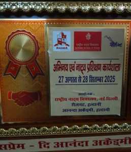 हल्द्वानी। राष्ट्रीय नाट्य विद्यालय नई दिल्ली, शेलनेट और आनंदा अकादमी हल्द्वानी के सयुक्त तत्वावधान में आयोजित अभिनय एवं नाट्य प्रशिक्षण कार्यशाला के समापन अवसर पर राजकीय मेडिकल कालेज प्रेक्षागार मै चिकित्सा के क्षेत्र मै उत्कृष्ट कार्य के लिए डॉ ललित मोहन रखोलिया, संयुक्त निदेशक, टनकपुर जनपद चंपावत को सम्मानित किया गया। इस अवसर पर विधायक वंशीधर भगत, महापौर गजराज सिंह बिष्ट, शेलनेट निदेशक डॉ डी एन भट्ट, श्रीश डोभाल, चंदन बिष्ट, रचना बिष्ट सहित अनेक लोग मौजूद रहे ।